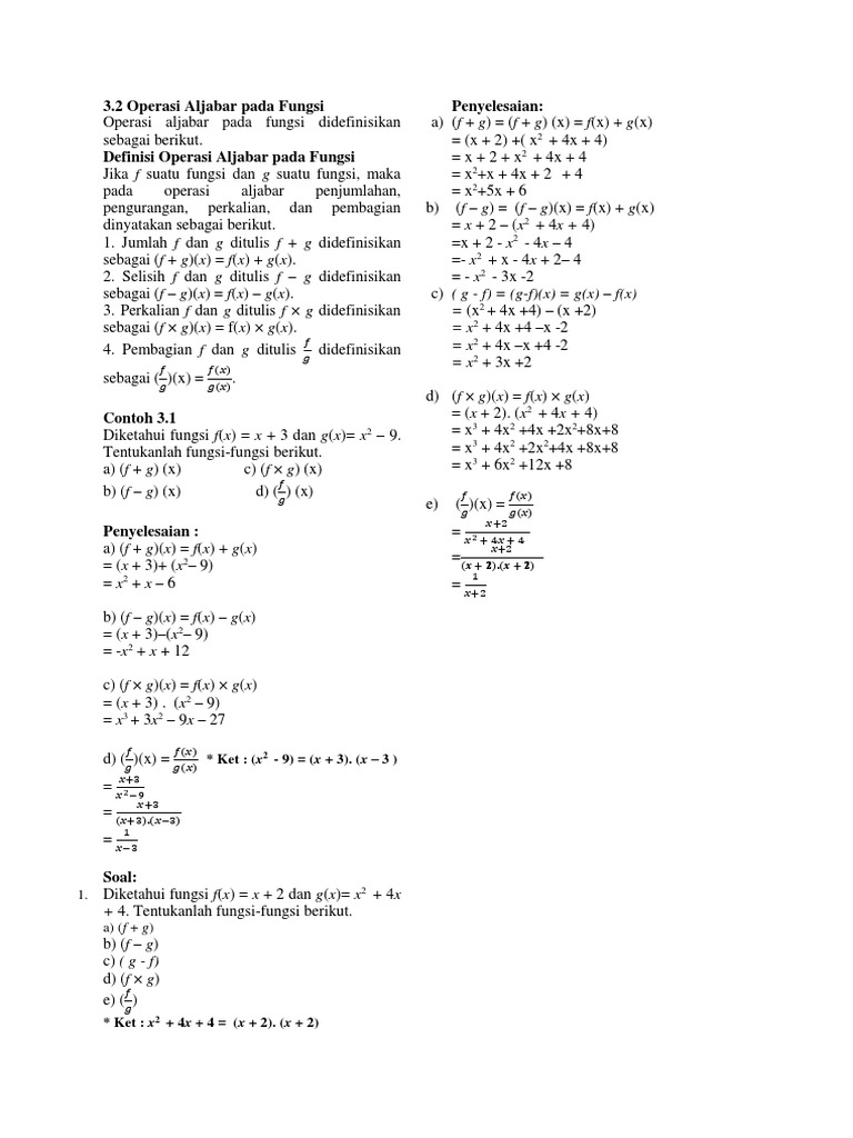 Operasi hitung penjumlahan dan pengurangan bentuk aljabar. Operasi aljabar pada fungsi yang akan dijelaskan disini meliputi: Opeasi aljabar penjumlahan, pengurangan, perkalian, dan. Diketahui fungsi f(x) = (x + 2)2 dan g(x) = (2x + 4)2 , maka tentukanlah hasil dari Penjumlahan, pengurangan sedangkan operasi pemangkatan dengan pangakt bulat, mengikuti aturan operasi perkalian.